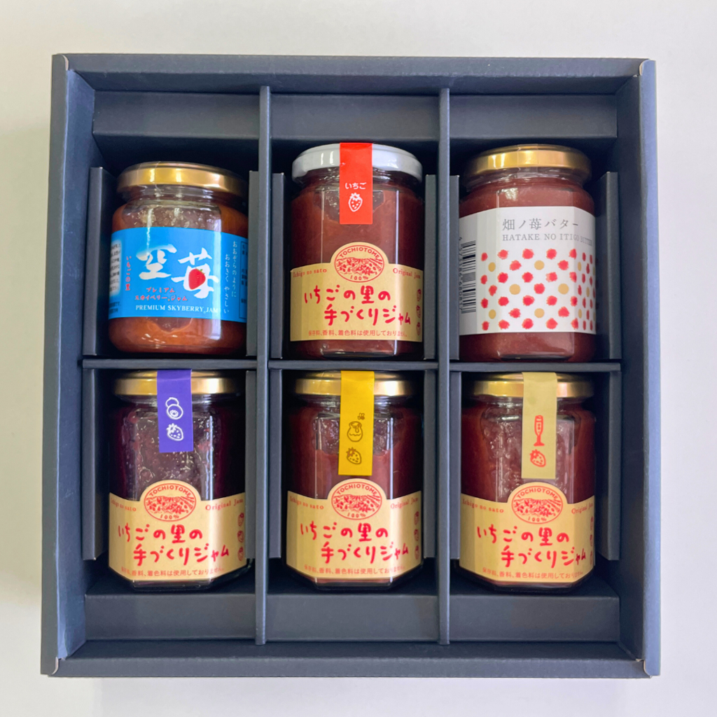 いちごジャム:いちご、砂糖、レモン果汁 スカイベリージャム:いちご(スカイベリー)、砂糖、レモン果汁 いちご&はちみつジャム:いちご、はちみつ、レモン果汁 いちご&ブルーベリージャム:いちご、ブルーベリー、砂糖、レモン果汁 いちご&スパークリングワインジャム:いちご、スパークリングワイン、砂糖、レモン果汁 苺バター:いちご、砂糖、バター(乳成分を含む) |